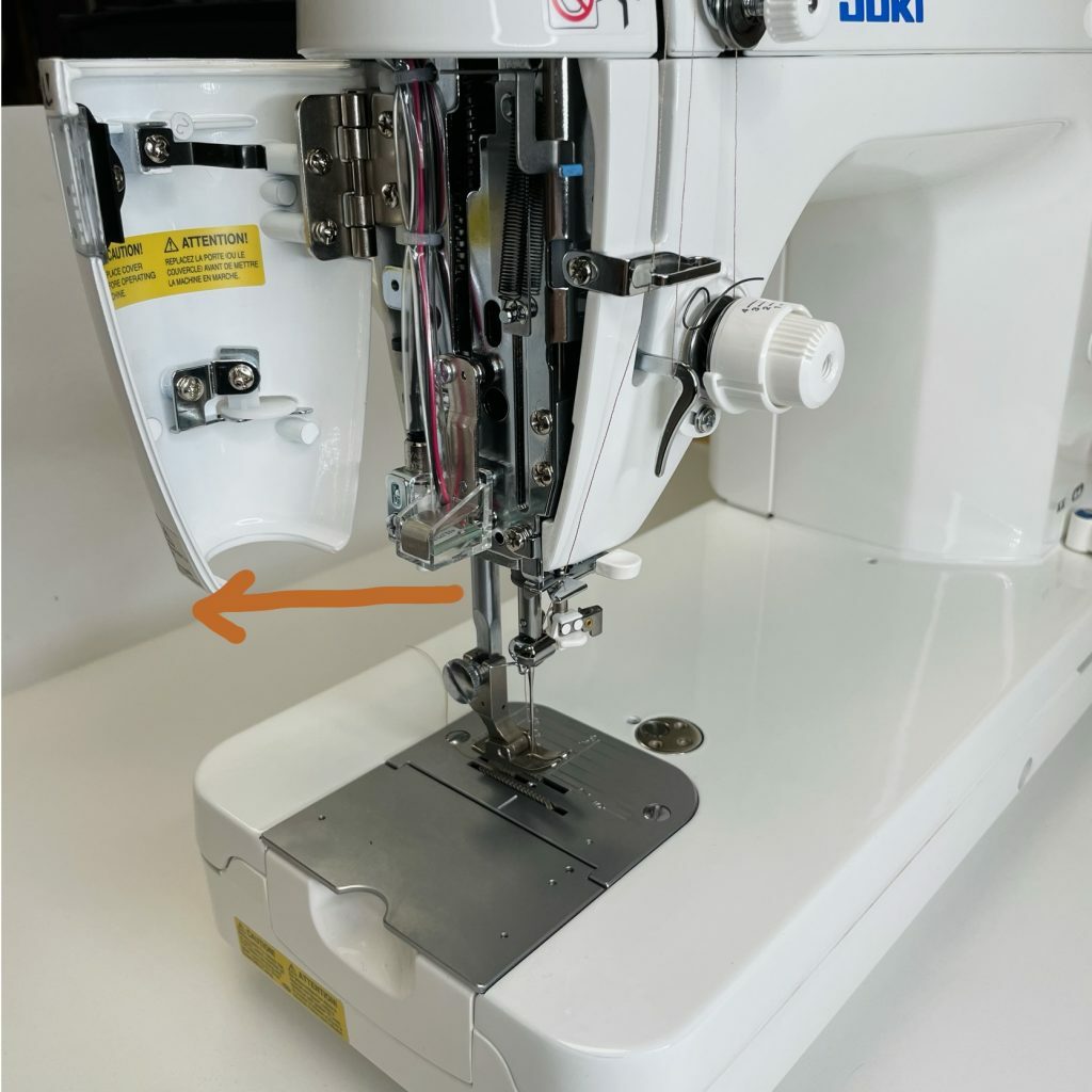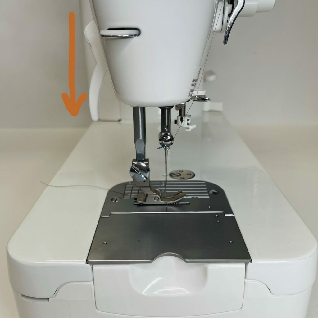 Now look on the head of your machine where the little window for your presser foot pressure is. Pull that cover to the left and it should slide open. See the picture below: