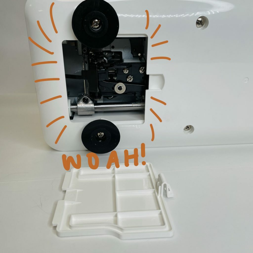 Next, if you notice on the bottom of your machine, there is a little door. Before tilting the machine on its backside, make sure the presser foot is down. As pictured below.