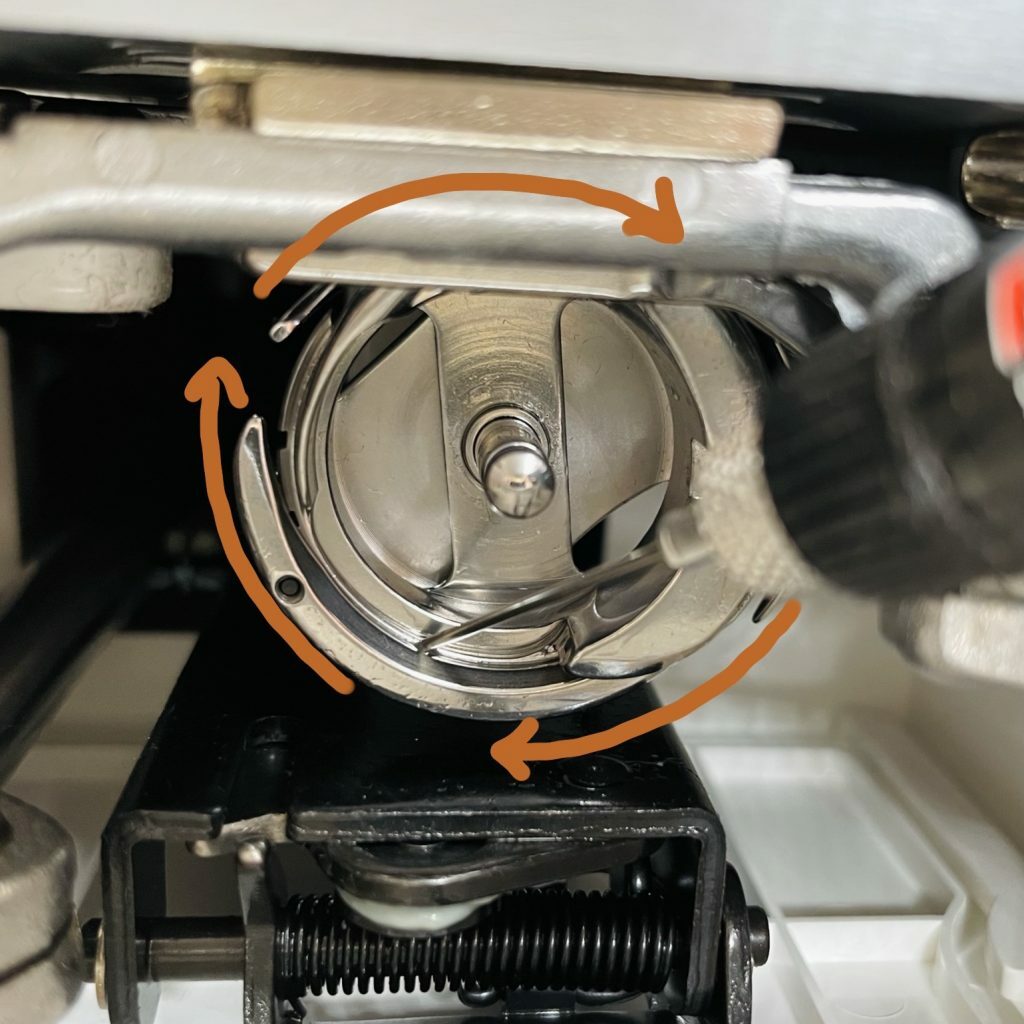 And lastly, in my opinion, the most important spot to oil is located inside your machine. Lift up your bobbin cover on the left side and remove the bobbin and bobbin case completely. Pictured below is the bobbin holder unit. Right where the tip of the oiling pen sits is where you will place your single drop of oil. Oil this hook every full bobbin exchange.