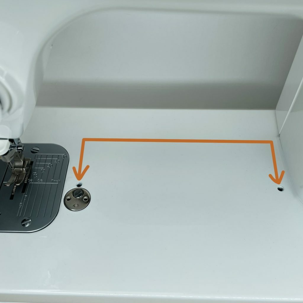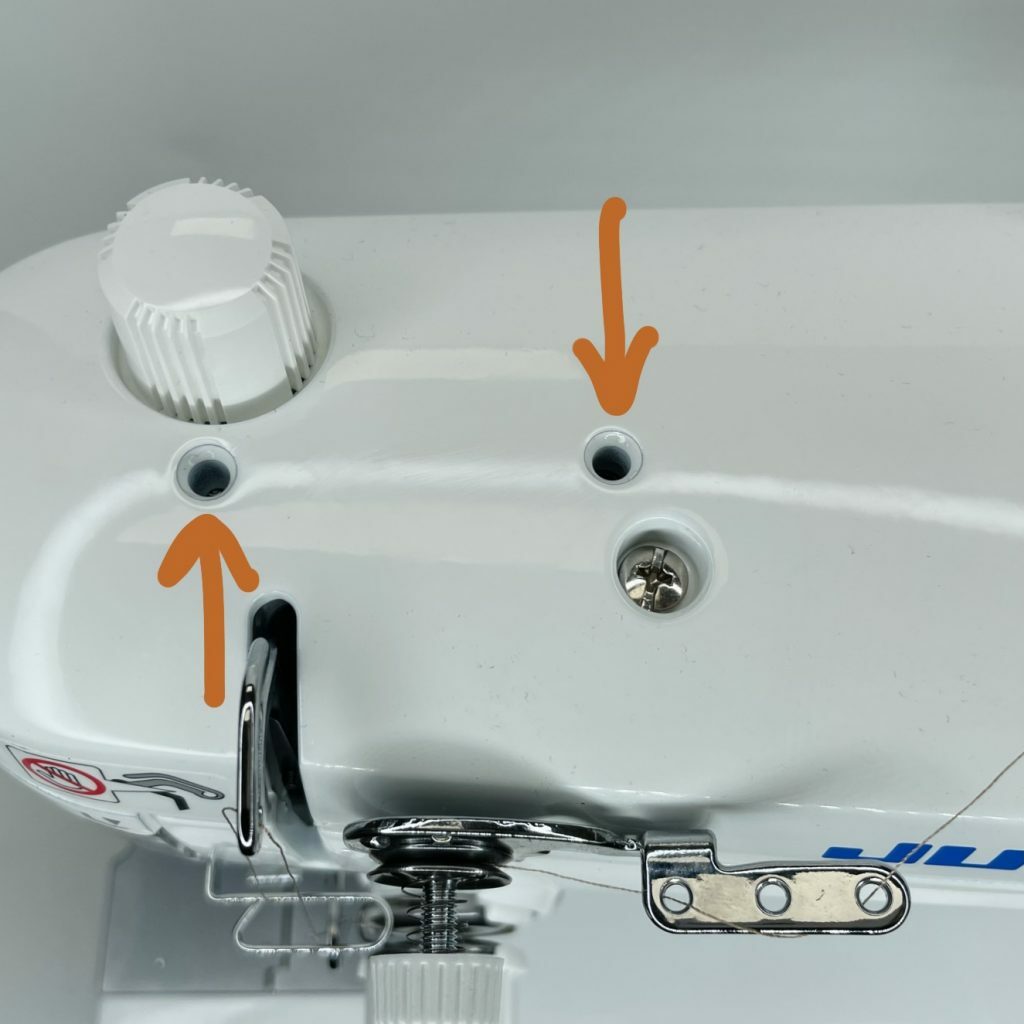 Last stop, the needle plate. On the needle plate, you can find 2 screws located on the front and the back of the metal plate. Go ahead and unscrew them, as well as your presser foot. Keep the screws close by! They are tiny, and too important to lose. Once you have everything taken off, you will see your feed dogs. See in the picture below.