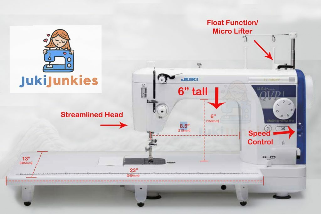The throat space is 6” high by 8.5” wide. This make it easy for rolling quilts and constructing bags. Additionally, the head shape of the machine is streamlined, giving you great visibility from both front and side angles. Notice it’s not as bulky as a computerized machine. I love this while free motion quilting because it allows me to see my quilting from the side view too.