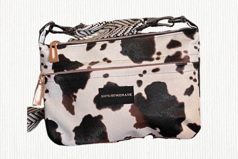 Linda L. created this cow print zipper bag on her DX-2000QVP. She used vinyl on the outside layer and lined with quilters cotton. She backed with Pellon SF101.