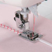 - Sew with the edges of the fabric aligned with the guide. The prong in the opening of the presser foot presses down the edge of the fabric to prevent puckering. In addition, the amount of thread going into the stitching is adjusted by the thread crossing the prong, creating a clean finish with little shrinkage.