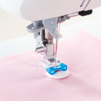 - Sew with the edges of the fabric aligned with the guide. The prong in the opening of the presser foot presses down the edge of the fabric to prevent puckering. In addition, the amount of thread going into the stitching is adjusted by the thread crossing the prong, creating a clean finish with little shrinkage.