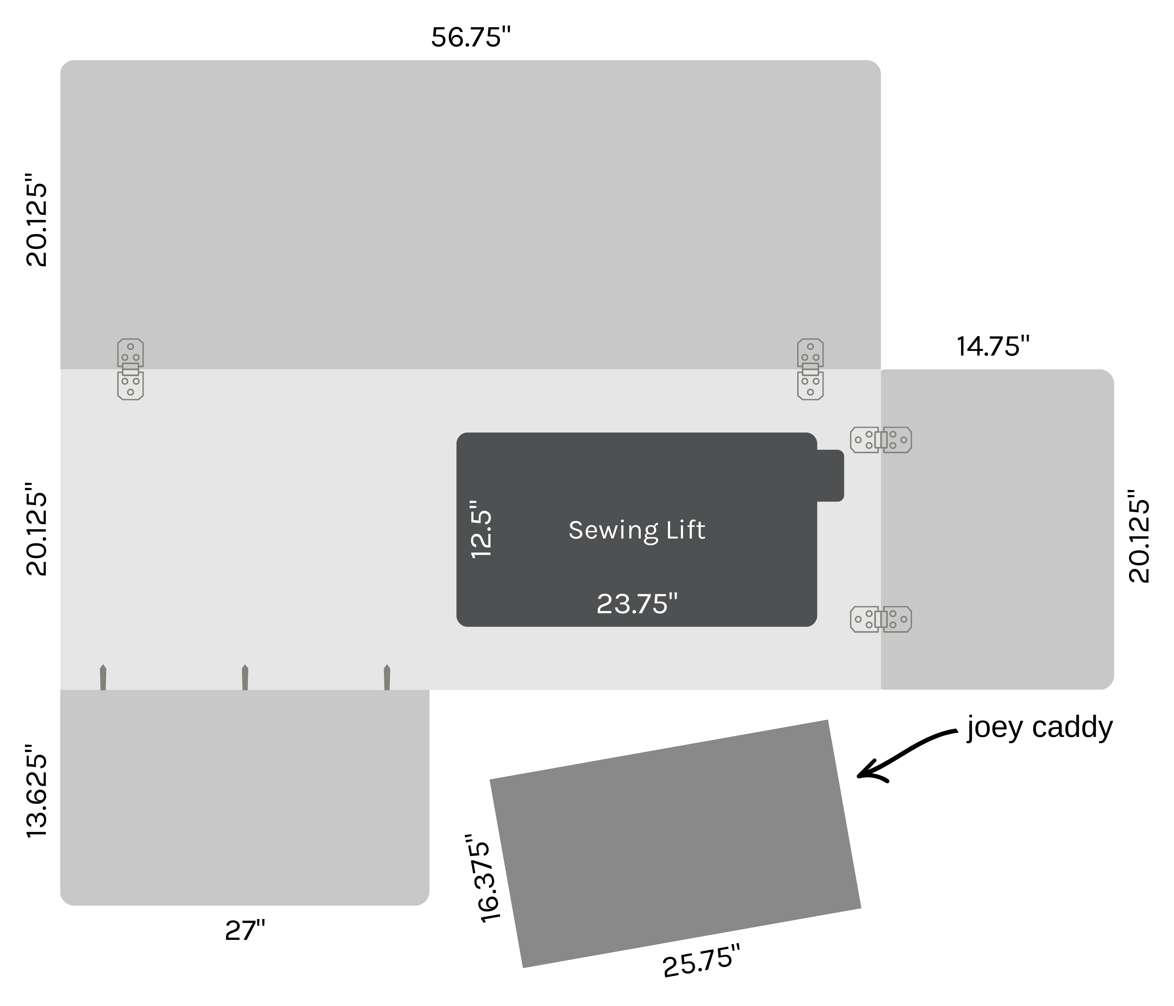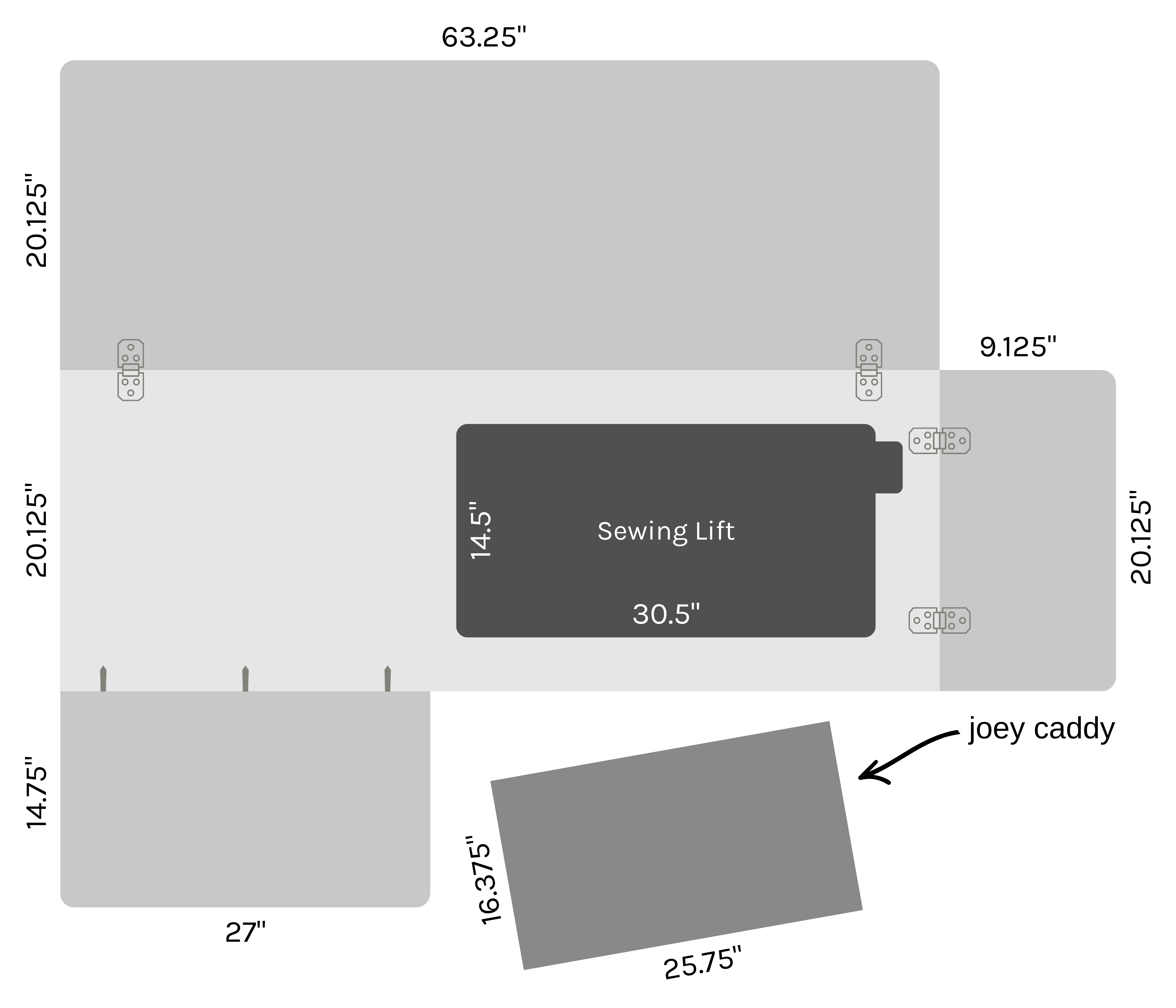 | Kangaroo XL Sewing Cabinet Dimensions (closed): | 63 ¼” W × 20 ⅛” D × 29 ½” H |